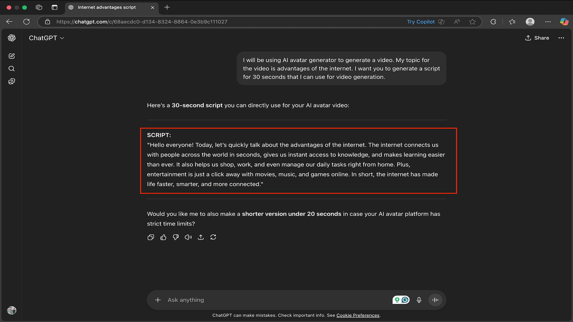 The script generated by ChatGPT may require some changes and fact-checking. So, give it a check and proofread it before you use it for avatar creation.